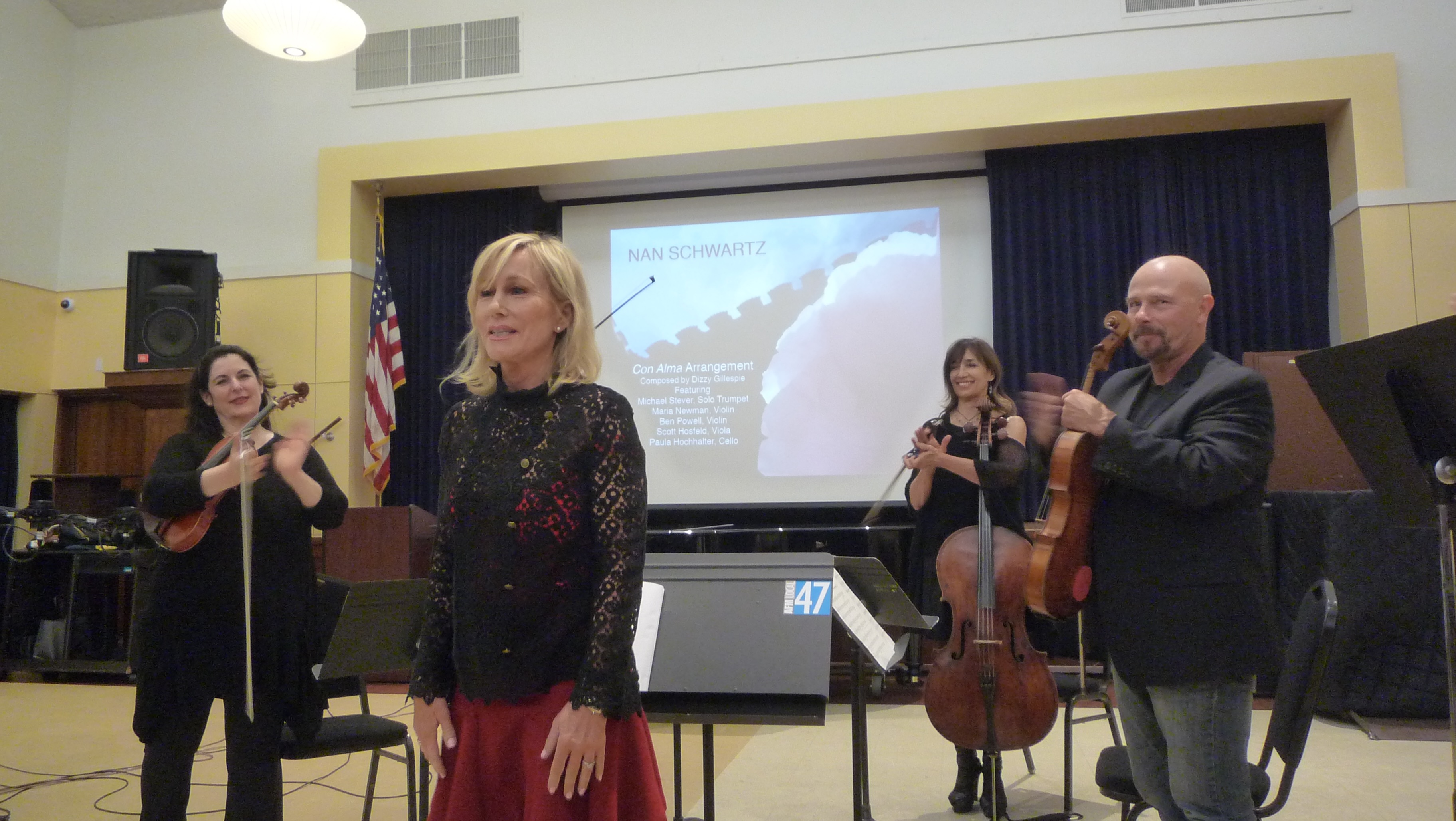 Nan Schwartz’s stunning arrangement of “Con Alma” by Dizzy Gillespie was played by Michael Stever on trumpet and accompanied by the masterful string quartet: Ben Powell, Maria Newman, Scott Hosfeld and Paula Hochhalter. The song is usually done as a fast bebop tune. Nan said this was an arrangement she wrote for Arturo Sandoval’s CD “Dear Diz,” and shared that Arturo will be performing it with a string quartet at her concert at Vibrato Jazz Grill on June 15.