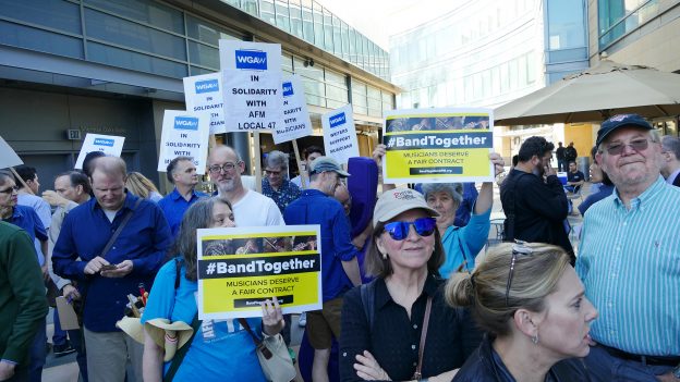 In Sherman Oaks, a large crowd gathered in the morning outside the Alliance of Motion Picture and Television Producers headquarters, where bargaining resumed today, to perform live music and rally with leaders from entertainment unions including SAG-AFTRA and WGA West. In New York, a concurrent rally took place outside NBCUniversal headquarters at Rockefeller Center with Congressman Jerrold Nadler and AFM members. The rallies follow several public actions held in recent weeks in Nashville, New York and Los Angeles. Continue reading