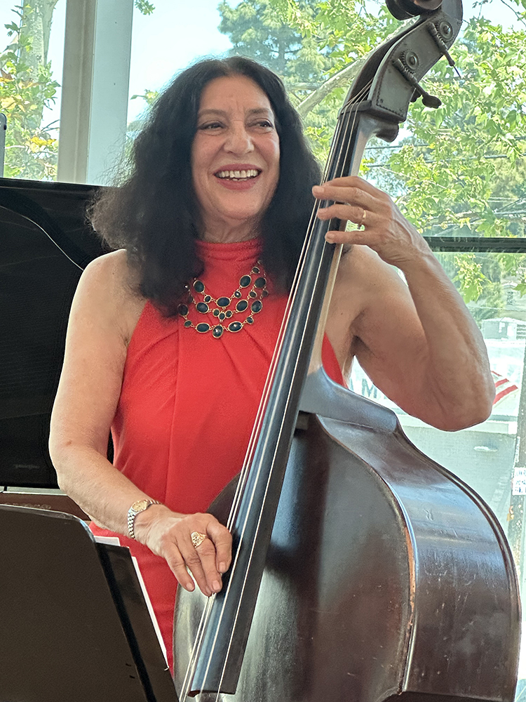 Leslie Baker with the beloved bass that first belonged to Serena Kay Williams, which they lovingly referred to as “our bass” during their many talks together; Leslie now calls the instrument “Serena.”