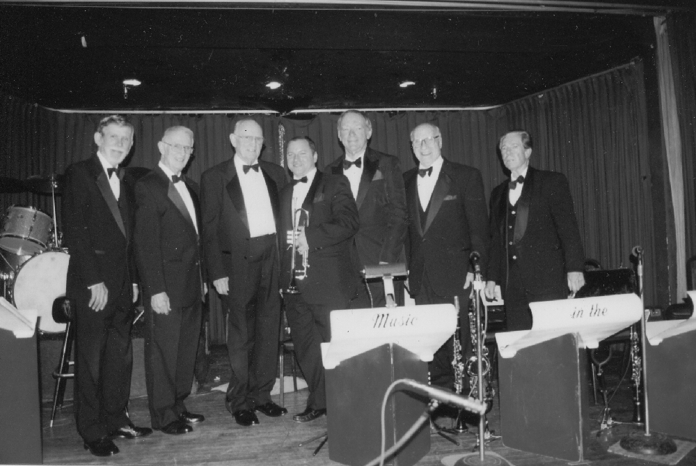 BROTHERS WHO PLAY TOGETHER STAY TOGETHER — Brothers Don and Slim performed together at the Mayflower Ballroom for 23 years until its closure in 2003. The Tanner Brothers Orchestra, pictured in March 2006 (left to right): Byron Long (piano), Slim Tanner (bass), Don Tanner (drums), Mike McGuffey (trumpet), John Bambridge (sax), Johnny Rotella (sax), and Bob Efford (sax). (Photo courtesy Slim Tanner)