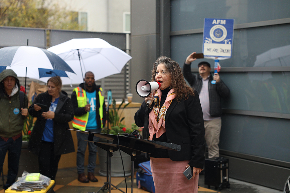 A little rain couldn’t dampen the high spirits of close to 300 AFM members and supporters during a morning rally and press conference on Jan. 22, 2024 in front of the Alliance of Motion Picture and Television Producers (AMPTP) headquarters in Sherman Oaks, CA on the first day of negotiations for the Motion Picture/TV Film contract.