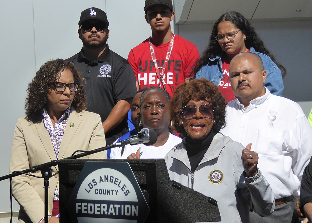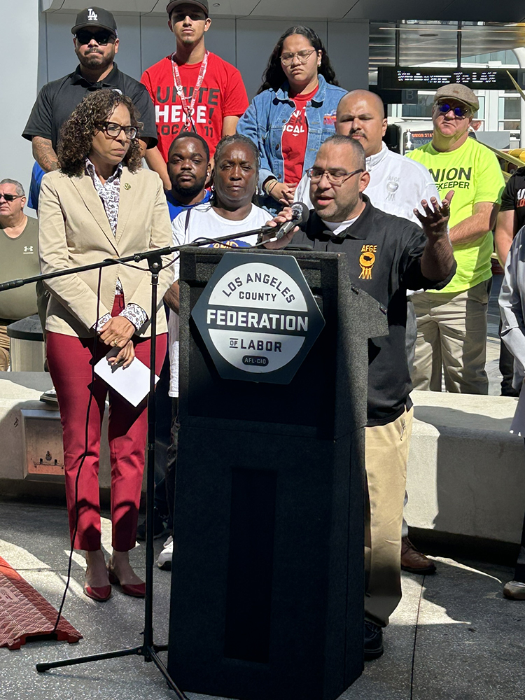 Speaking at the press conference were AFGE TSA Local 1260 President Bobby Orozco Jr., Congresswoman Maxine Waters (CA-35), Congresswoman Sydney Kamlager-Dove (CA-37), Assemblymember Luz Rivas (CA-29), Labor Community Services Executive Director Norma Lopez, and LA County Federation of Labor President Yvonne Wheeler.