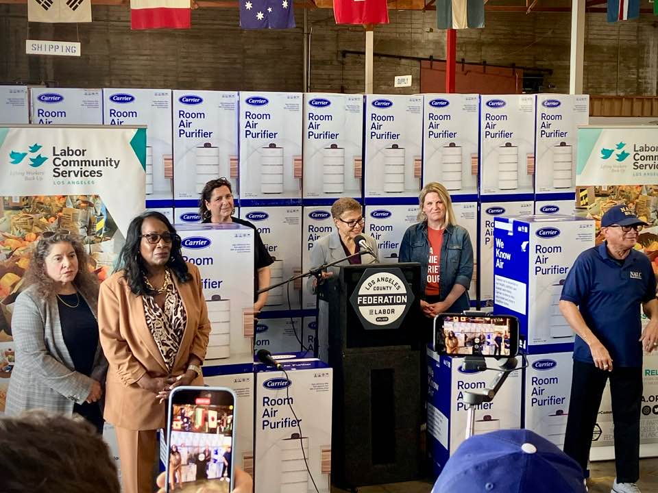 On Saturday, Feb. 22, AFL-CIO President Liz Shuler joined L.A. Fed President Yvonne Wheeler and local union leaders at the LCS warehouse to distribute resources. In addition to food boxes, members were provided with air purifiers, food vouchers, toiletries, feminine hygiene products, and baby products.