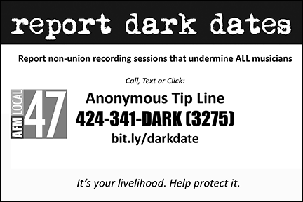 The American Federation of Musicians will fight to make ALL scoring sessions Union sessions. Please report the time and location of non-union recording sessions to the AFM Local 47 Electronic Media Division through our anonymous tip line: Call/text 424-431-DARK (3275) or click bit.ly/darkdate