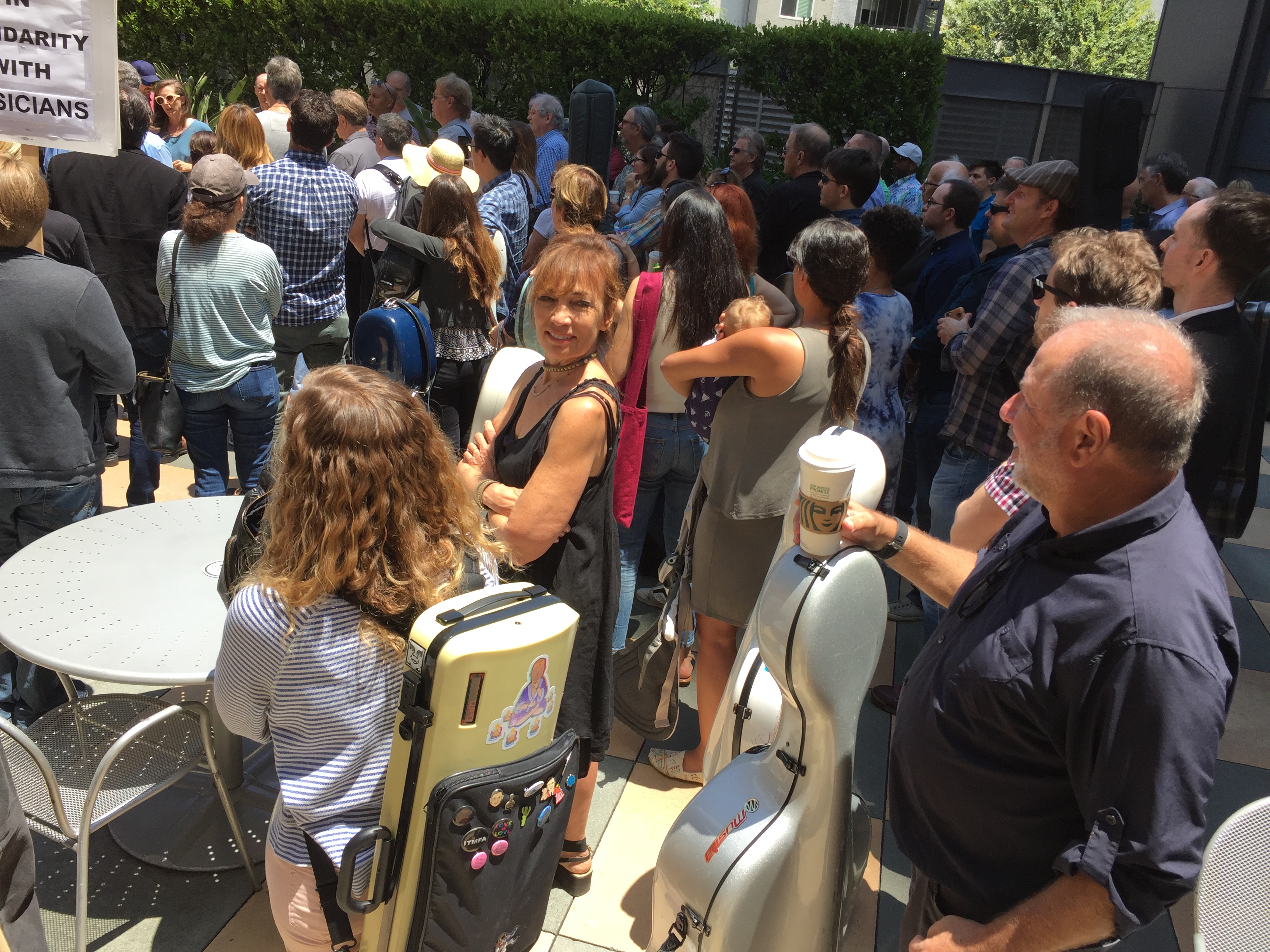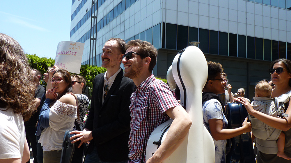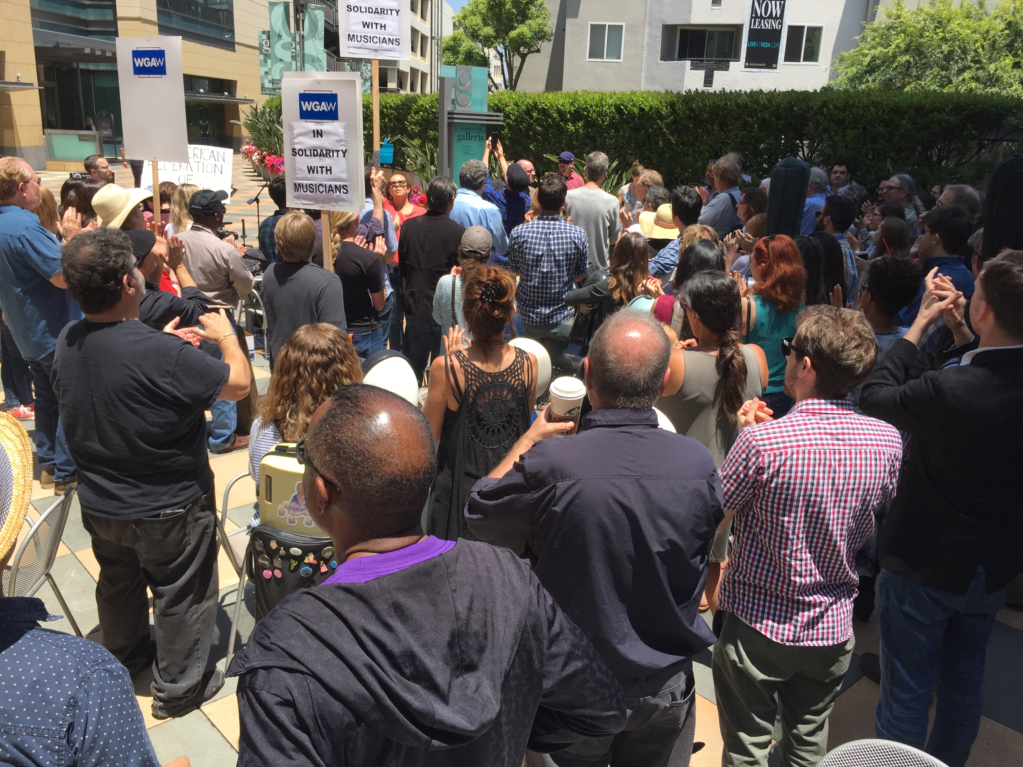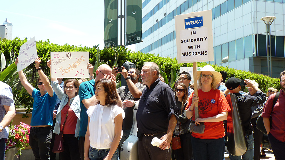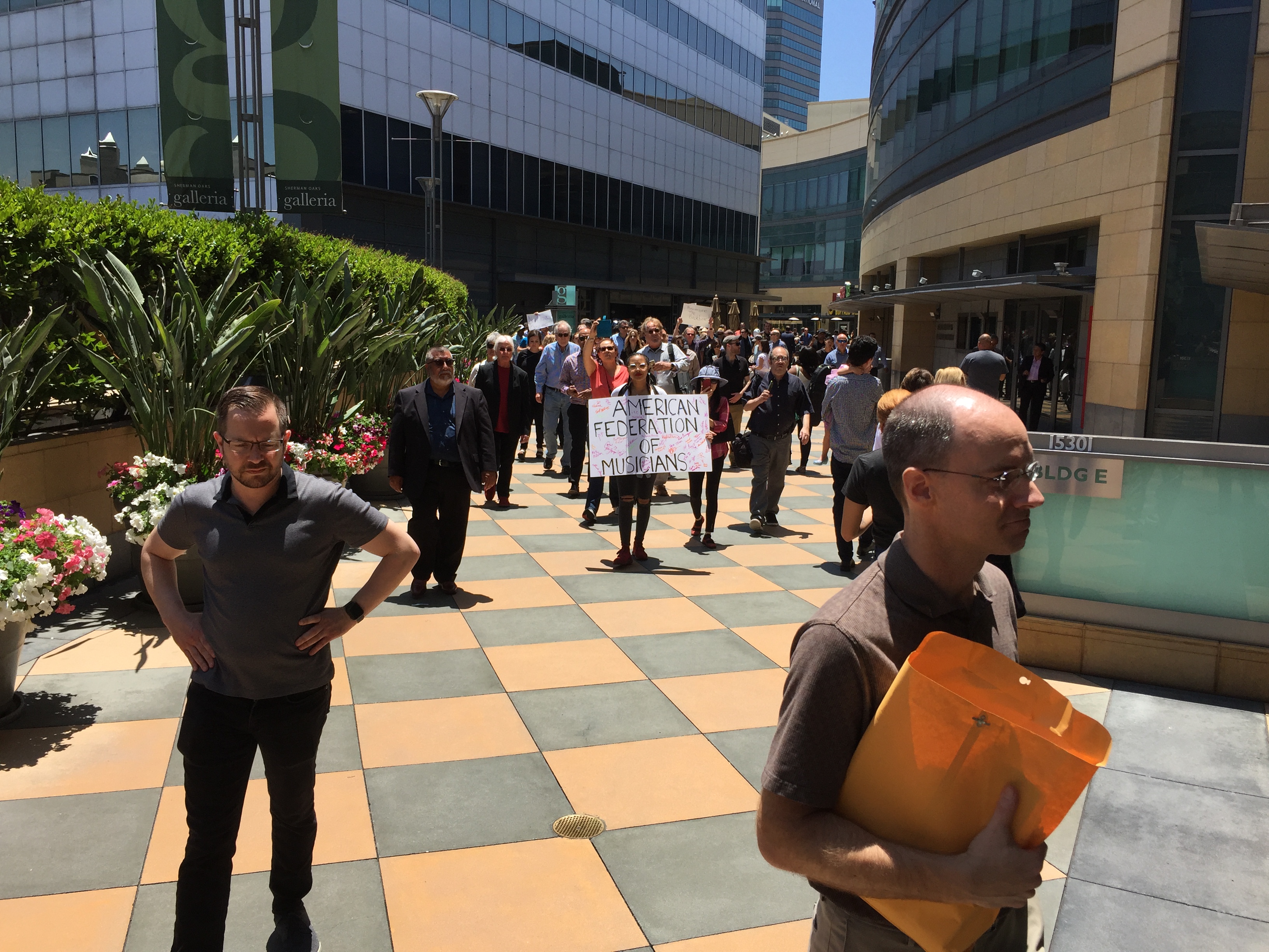 Musicians marched to the front doors of the Alliance of Motion Picture and Television Producers to hand-deliver hundreds of petitions signed by musicians who work in the industry, where studio representatives denied them entrance. “They are in this building and they are willing to deny us behind closed doors, but they will not do it in the open,” said musician and organizing committee member Jason Poss. “They will receive these petitions, even though they don’t want to receive them today. This is a victory. We have shown what is going on and they cannot hide from us any longer. This is just the beginning.”