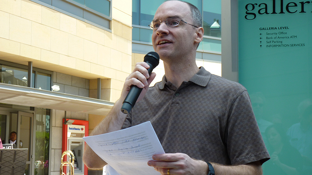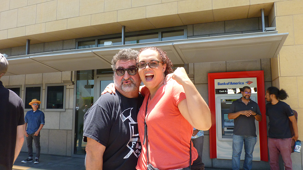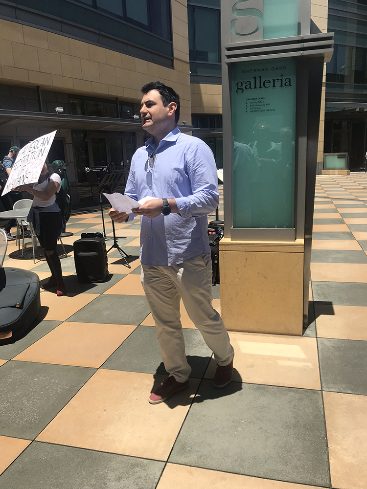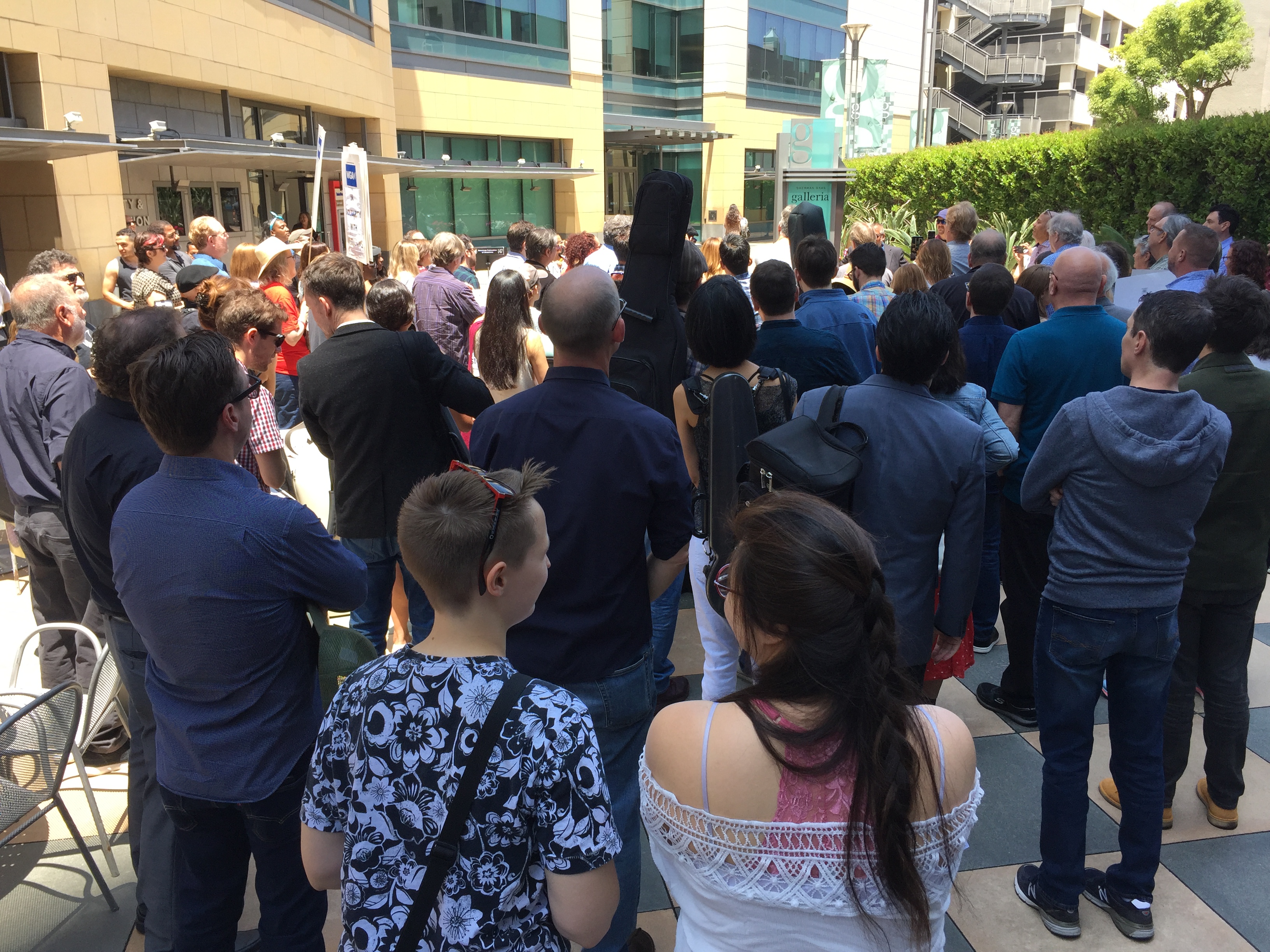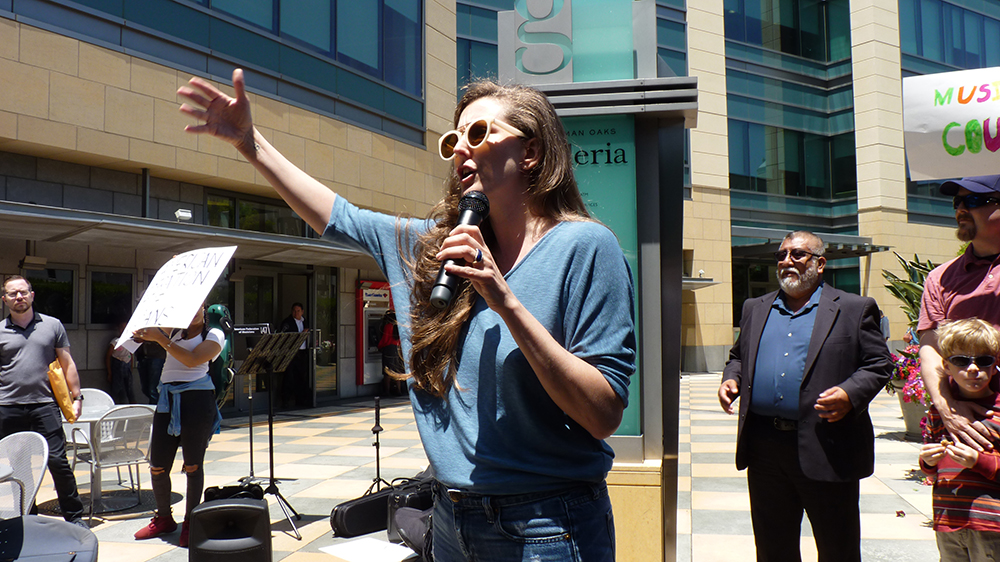 Musicians marched to the front doors of the Alliance of Motion Picture and Television Producers to hand-deliver hundreds of petitions signed by musicians who work in the industry, where studio representatives denied them entrance. “They are in this building and they are willing to deny us behind closed doors, but they will not do it in the open,” said musician and organizing committee member Jason Poss. “They will receive these petitions, even though they don’t want to receive them today. This is a victory. We have shown what is going on and they cannot hide from us any longer. This is just the beginning.”