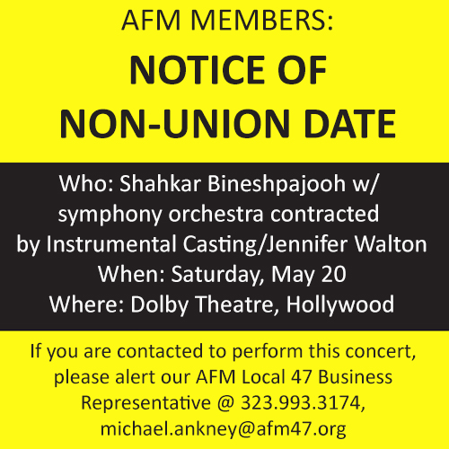 AFM Members: Please be aware that the Shahkar Bineshpajooh concert with symphony orchestra, contracted by INSTRUMENTAL CASTING/Jennifer Walton, Saturday, May 20, 2017 at the Dolby Theatre is a non-union date.