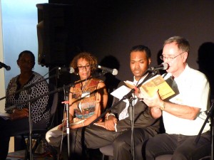 L.A. Board of Public Works Commissioner Mike Davis solicits “friendraising” from the audience.
