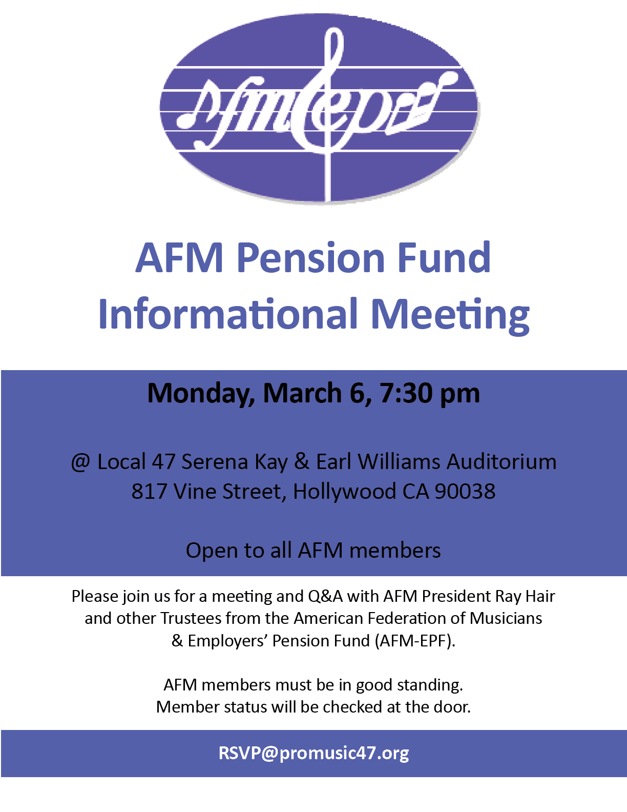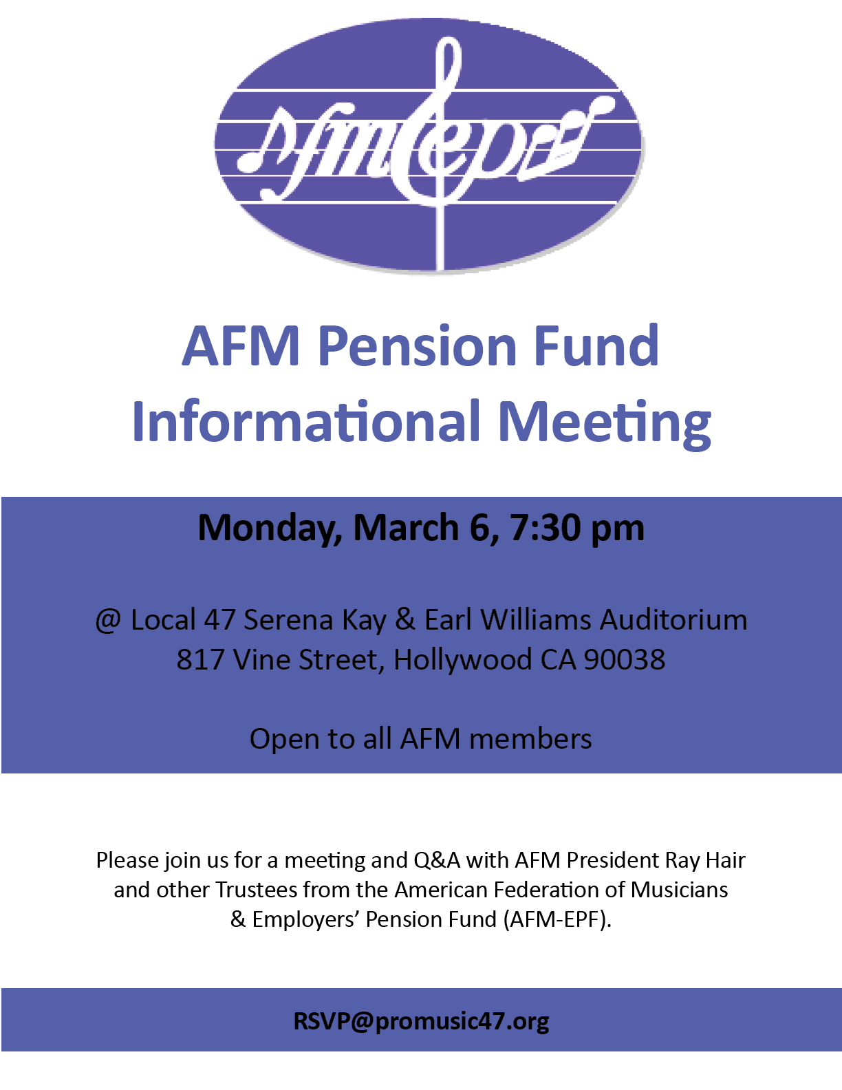 On July 18, 2019, AFM Local 47 John Acosta on behalf of the entire Executive Board sent the following letter to AFM & Employers’ Pension Fund Trustees stressing the importance of considering the input of all musicians who are stakeholders, particularly those currently working and contributing to the Fund.