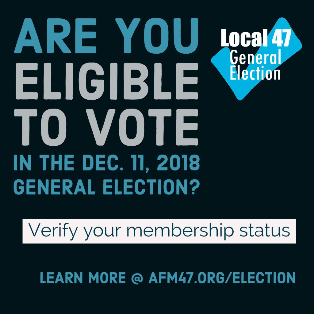 The next General Election for the AFM Local 47 Executive Board, Hearing Board, and AFM Convention Delegates takes place on Tuesday, December 9, 2025.