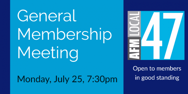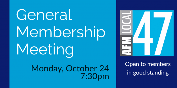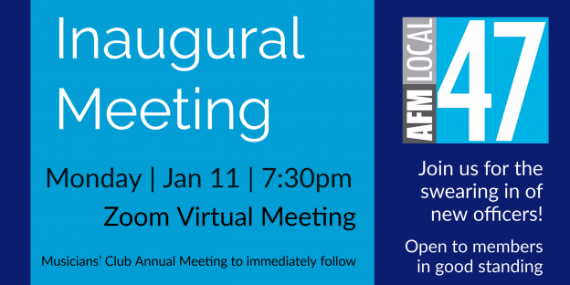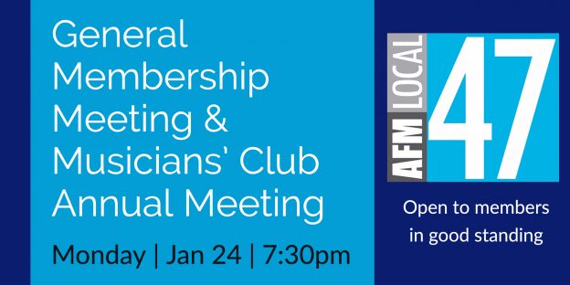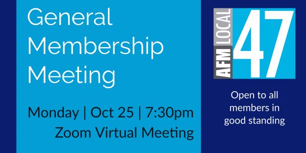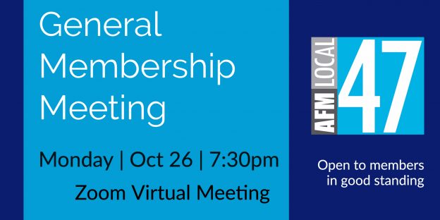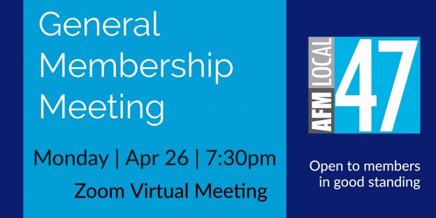 Open to all AFM Local 47 members in good standing. Members will receive an email invitation to register and may also register via our website at afm47.org/gmm. Registration is required. Once your membership is verified, you will receive an email with the Zoom access link.