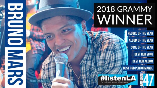 Bruno Mars swept the 60th annual GRAMMYs, taking home awards in all categories nominated including the night’s biggest wins: Record of the Year and Album of the Year (“24K Magic”), and Song of the Year (“That’s What I Like”). The Los Angeles AFM Local 47 artist also won in the categories of Best R&B Album, Song and Performance. Continue reading