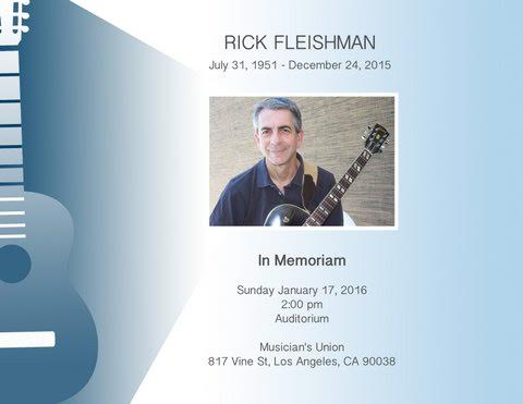 On Christmas Eve my dear friend Rick Fleishman departed this world after a 10-month battle with brain cancer. Rick was an intelligent, ethical and talented human being whom I met while working casuals some 36 years ago. Our friendship, along with musical and business partnerships, grew quickly. He was a great guitar player with whom I collaborated with on many jazz, pop and movie projects. But most of all he was a close friend who will forever be missed. He is survived by his loving wife Albina and loyal daughter Sara. There will be a memorial to him at the Musician’s Union Sunday afternoon, January 17.