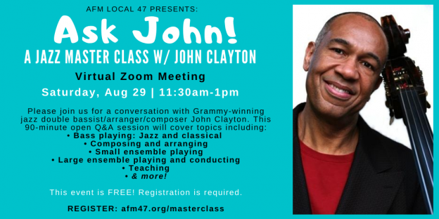 Jazz icon John Clayton — pictured above with AFM Local 47 President Stephanie O’Keefe — kicked off our 3rd Annual Jazz Festival, which honored Live Members, with a moving speech. Listen to it here: