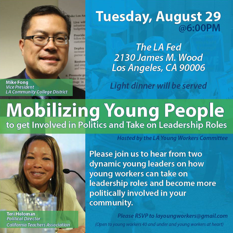 Who: Guest speakers Mike Fong, Vice President, LA Community College District; & Teri Holoman, Political Director, CA Teachers Association