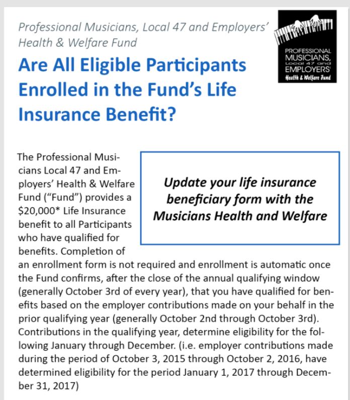 The Professional Musicians Local 47 and Employers’ Health & Welfare Fund (“Fund”) provides a $20,000* Life Insurance benefit to all Participants who have qualified for benefits. Completion of an enrollment form is not required and enrollment is automatic once the Fund confirms, after the close of the annual qualifying window (generally Oct. 3 of every year), that you have qualified for benefits based on the employer contributions made on your behalf in the prior qualifying year (generally Oct. 2 through Oct. 3). Contributions in the qualifying year, determine eligibility for the following January through December (i.e. employer contributions made during the period of Oct. 3, 2016 through Oct. 2, 2017, have determined eligibility for the period Jan. 1, 2018 through Dec. 31, 2018). Continue reading