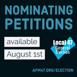 * Candidacy eligibility of nominees named here are subject to final verification as per Local 47 Bylaws Article IX, Sections 2, 5, 6 and 7. The official list of candidates for the Local 47 General Election as approved by the Election Board will be published in the Election “Special Edition” issue of Overture to be published in November.
