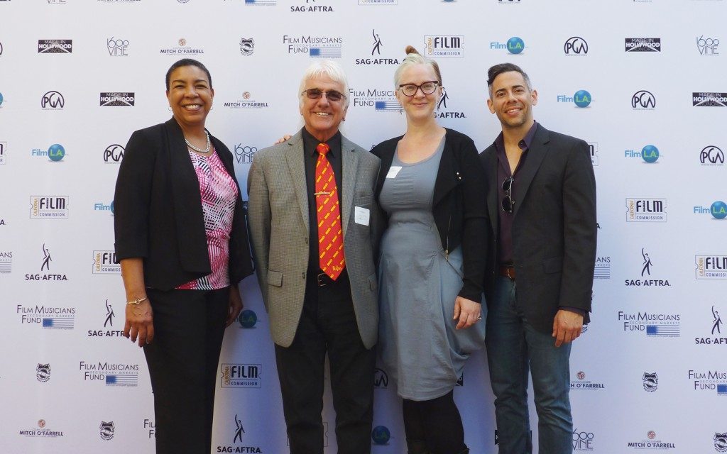 Los Angeles musicians celebrated Emmy-nominated TV shows scored here in L.A. at the 5th annual Made In Hollywood Honors for Television. From left: Film Musicians Secondary Markets Fund Executive Director Kim Roberts Hedgpeth, AFM Local 47 Secretary/Treasurer Gary Lasley, violinist Elizabeth Hedman, and Recording Musicians Association Los Angeles President Steve Dress. (Photo by Linda A. Rapka/AFM Local 47)