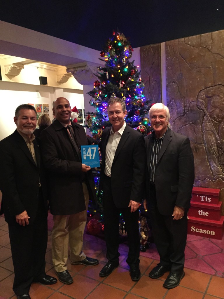 Our most recent plaque was presented to the El Portal Theatre on Dec, 22, 2015. Pictured above from left: Live Performance Business Rep Michael Ankney; President John Acosta; Jay Irwin, Manager, El Portal Theatre; and Secretary/Treasurer Gary Lasley.