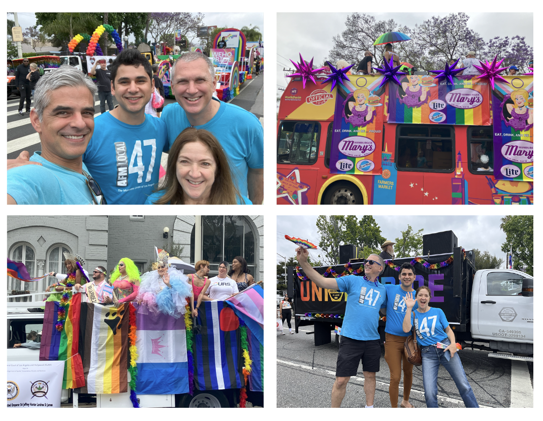 Our local labor community enjoyed a fun-filled day of solidarity at the 2024 Los Angeles Pride Parade in WeHo on Sunday, June 2. AFM Local 47 Organizer Rahul Neuman and members David Horne, Nick Cazares, and Amy Hershberger joined in the festivities alongside friends from the LA County Federation of Labor and members from many other unions throughout the region.