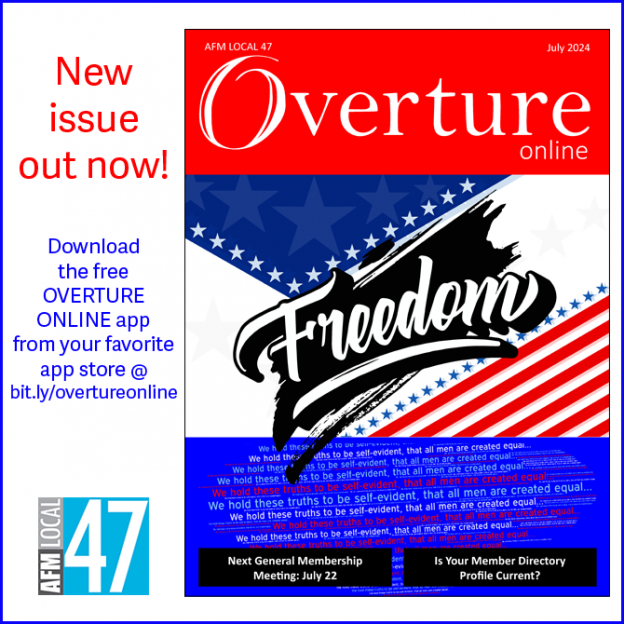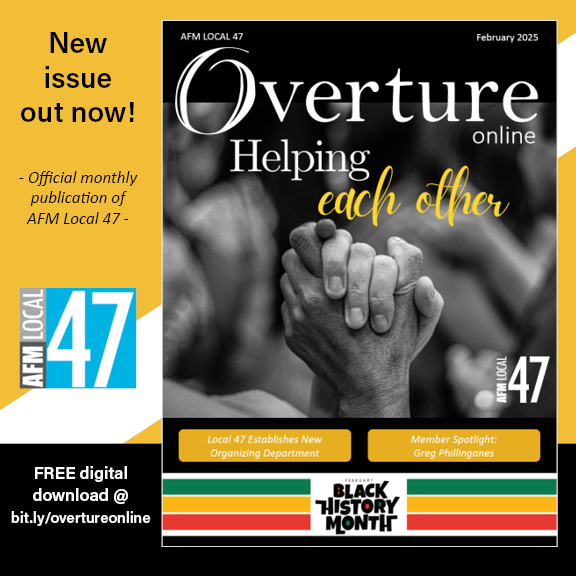 For exclusive members-only Overture content — Executive Board minutes, CBAs, Local 47 Wage Scales, Bylaws, Suspended/Expelled member lists, and more — log in to your new E2 member account at ensemble.afm47.org and browse the “Overture” section on the Documents page. (New to E2? Visit our E2 FAQ here.)