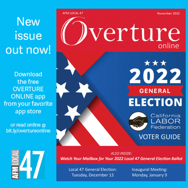 For exclusive members-only Overture content — Executive Board minutes, CBAs, Local 47 Wage Scales, Bylaws, Suspended/Expelled member lists, and more — log in to your new E2 member account at ensemble.afm47.org and browse the “Overture” section on the Documents page. (New to E2? Visit our E2 FAQ here.)